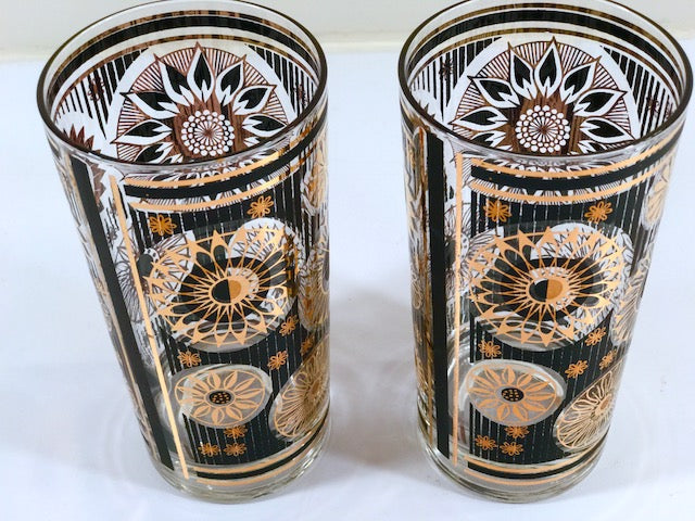 Fred Press Signed Mid-Century Black and 22-Karat Gold Abstract Flower Glasses (Set of 2)